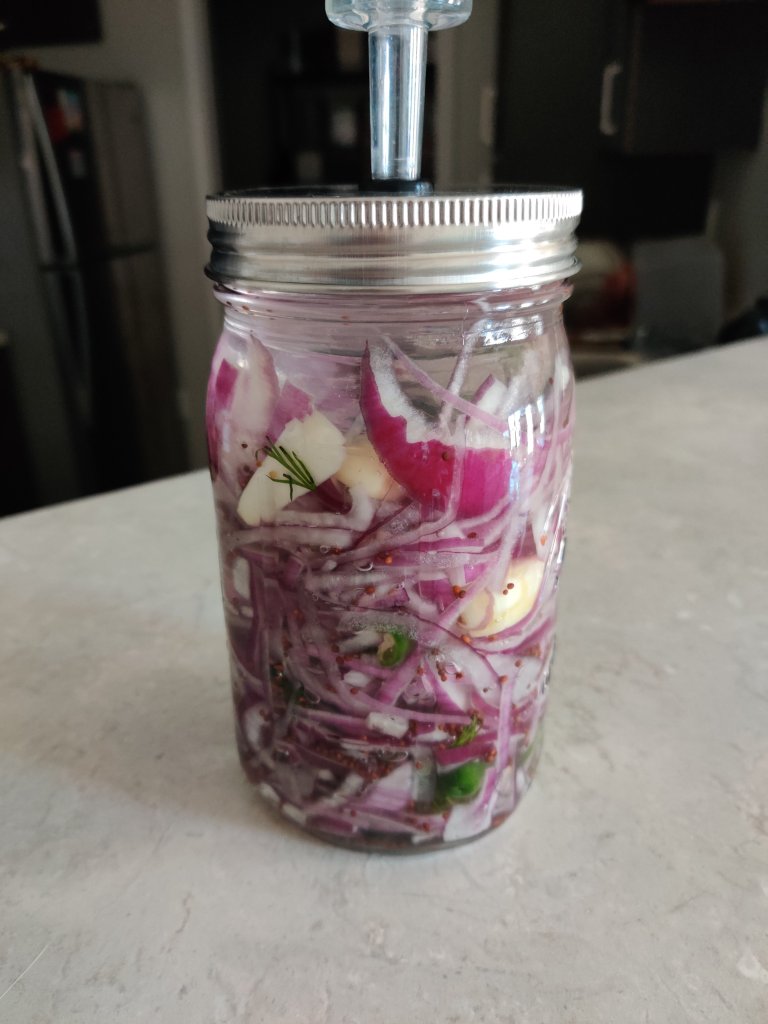 Today, I decided to make him a batch. I thinly sliced two red onions and combined them with four whole garlic cloves, some fresh dill, some brown mustard seeds, and two serrano peppers. After everything was prepared, I stuffed it in a mason jar and filled it with tap water. I weighed it and created a 2% salt brine. With an air-lock, the red onions should be done in a week.