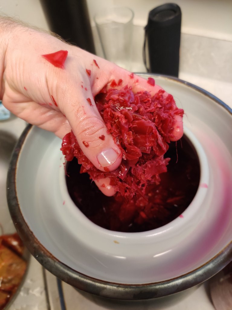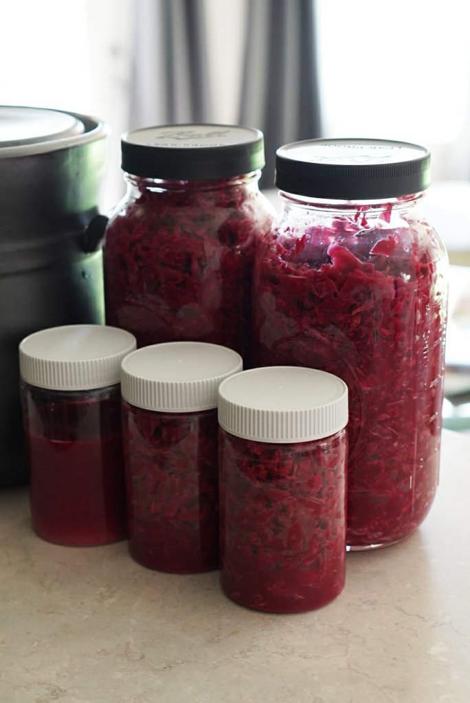 When I opened the kraut, and the farts fully released, I was struck by how bright purple the juice has become. After texting the gross, purple picture below to my friends and family, I transferred the concoction to mason jars. I’ll show the process below. The last pictures are a cross color comparison of a couple krauts in my fridge: regular kraut, turmeric carrot ginger kraut, and the purple ginger kraut.