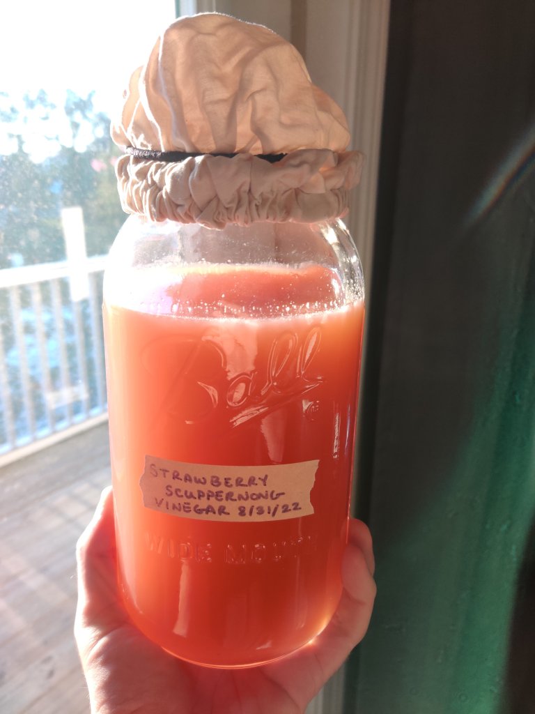As a bonus, today I started a strawberry scuppernong vinegar. I just juiced the leftover fruit I had in the fridge (<1.5 lbs fruit) and added water to bring it up to 5 cups of juice/water mix. I followed the same procedures as above.
