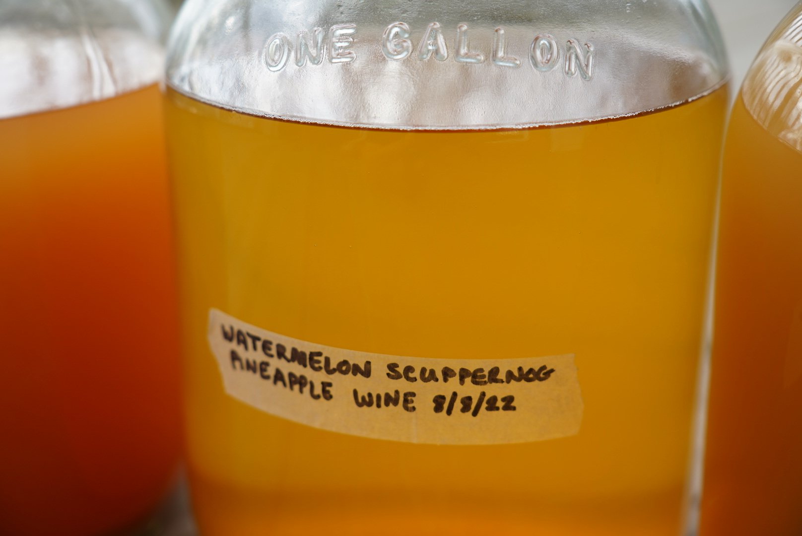From left to right; a pineapple ginger wine (bubbling moderately after one month), a watermelon, scuppernong, pineapple wine (bubbling strongly after one month), and a simple ginger cider that I started a couple days ago (bubbling ferociously).