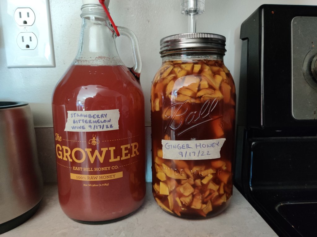 I returned home to meal prep for the week and I found the ferments bubbling happily. The cider smells like farts but it’s very brightly alive. The ginger already seeped out moisture and the honey has turned thin. Everything is alive.